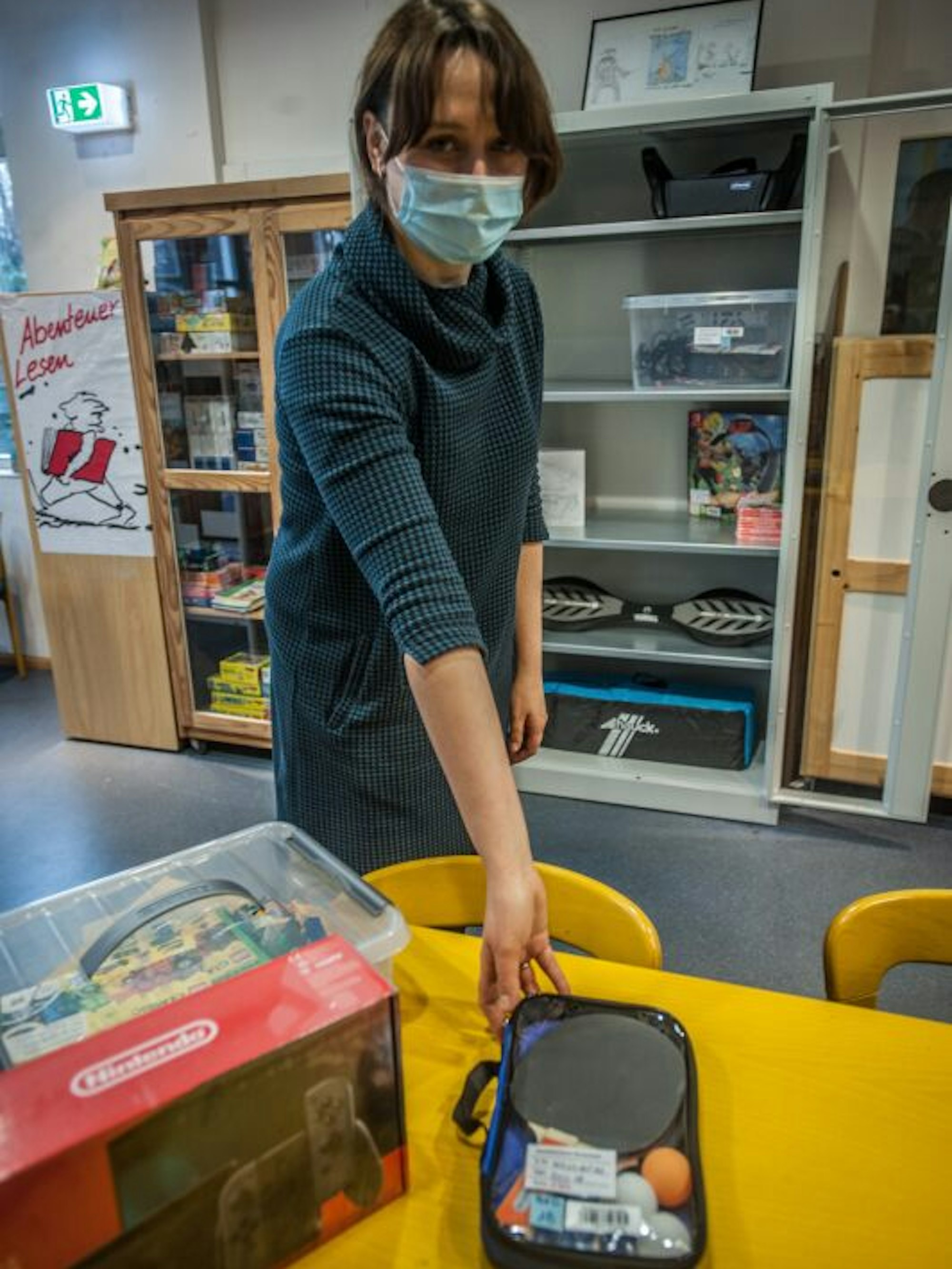 Büchereileiterin Yulia Farbischewski hat auch ein Tischtennis-Set im Angebot.