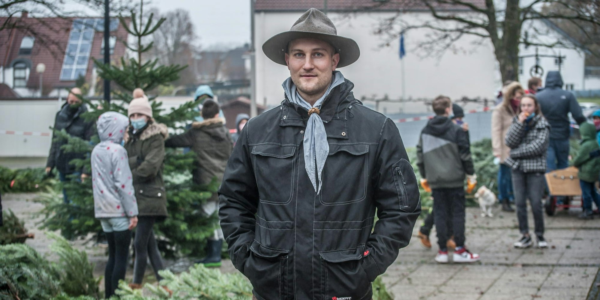 Pfadfinder Simon Frädrich beim Weihnachtsbaumverkauf seines Stammes „Woodstock“ an Sankt Franziskus. In der Corona-Pandemie leisteten die Pfadfinder Einkaufshilfe.