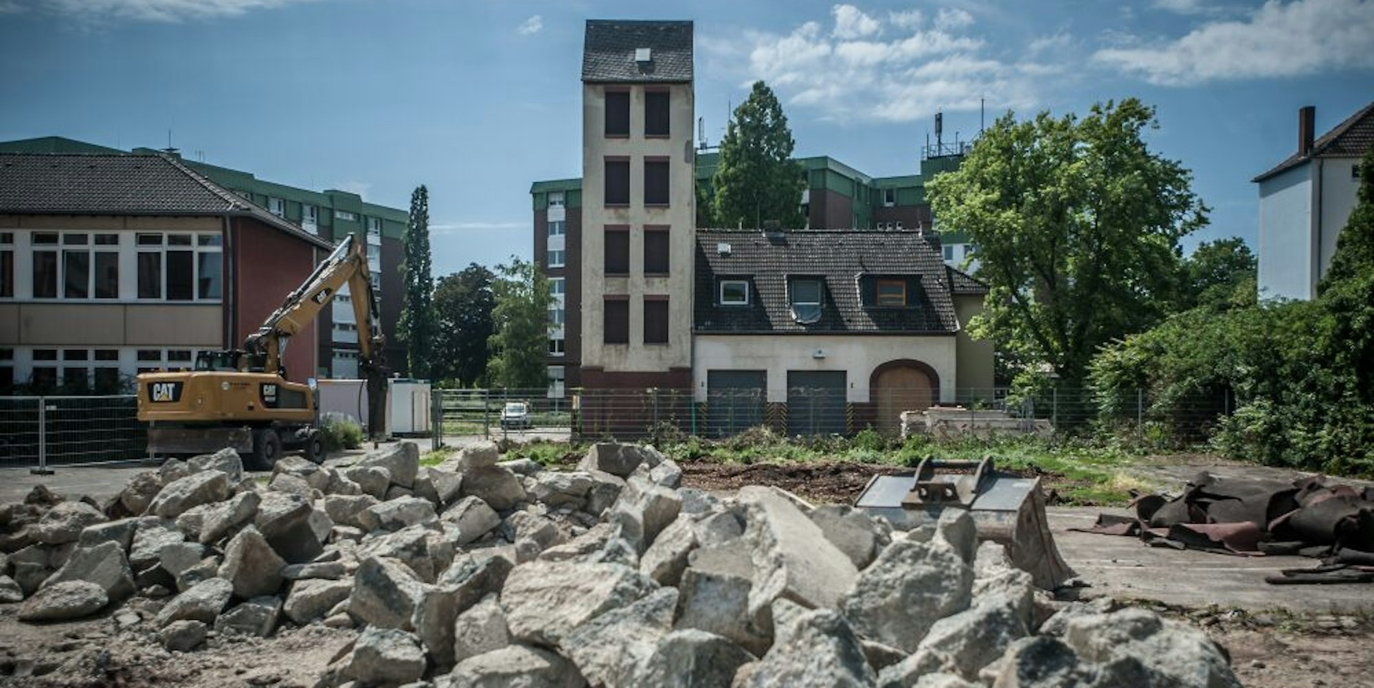Die im vergangenen Herbst begonnenen Arbeiten sind insoweit fortgeschritten, dass die alte Feuerwache an der Moskauer Straße inzwischen entkernt und für den Neuausbau vorbereitet ist. Zurzeit wird eine Sitzanlage aus Beton auf dem dahinter liegenden Schulhof abgebrochen (im Bild). Anschließend soll die alte Sporthalle abgerissen und durch eine neue Mehrzweckhalle für verschiedene Nutzungen ersetzt werden. Zum Zeitplan wie zur weiteren Kostenentwicklung sind derzeit keine Angaben zu erhalten.