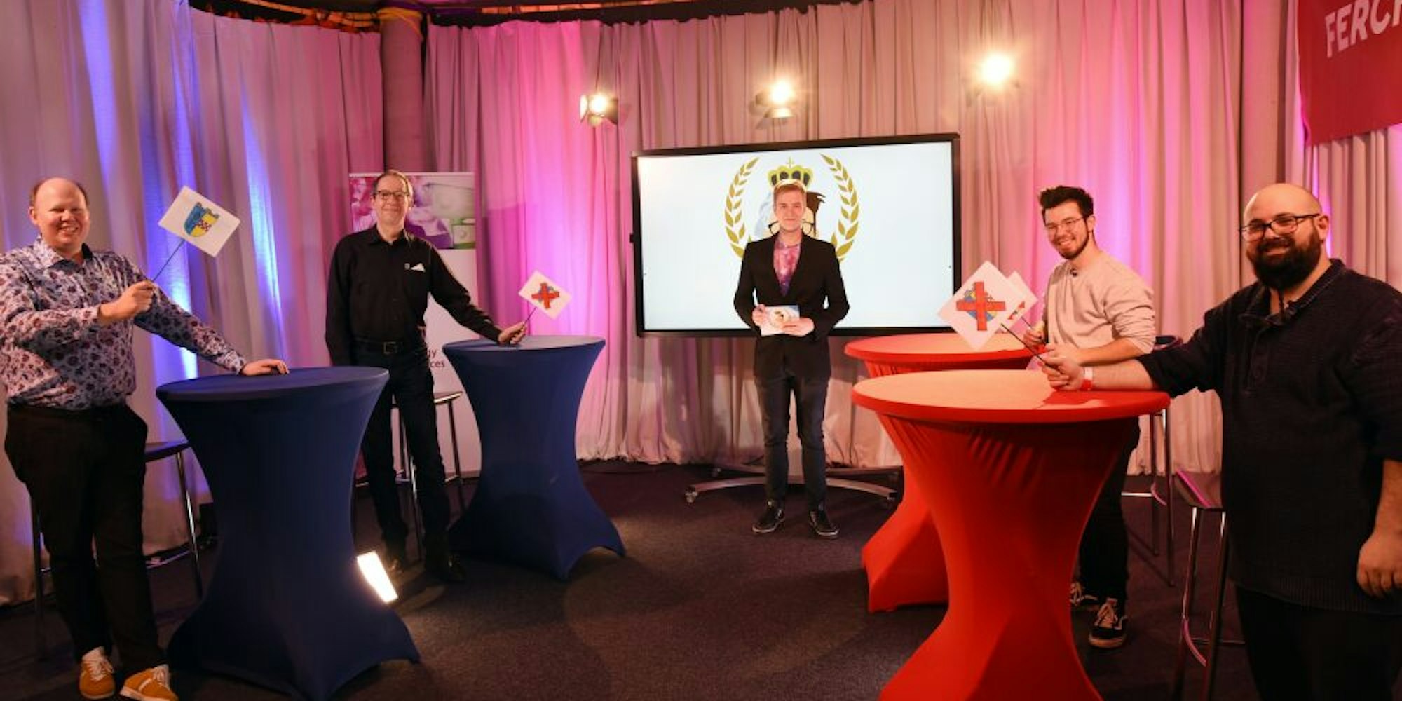 Professoren gegen Studenten im Live-Stream-Studio: (v.l.) Dekan und Prof. Dr. Chrstian Kohls mit Prof. Wolfgang Konen gegen Paul Wasner und Enrico Caltabiano auf der Seite der Studenten – moderiert von Tom Gerold.