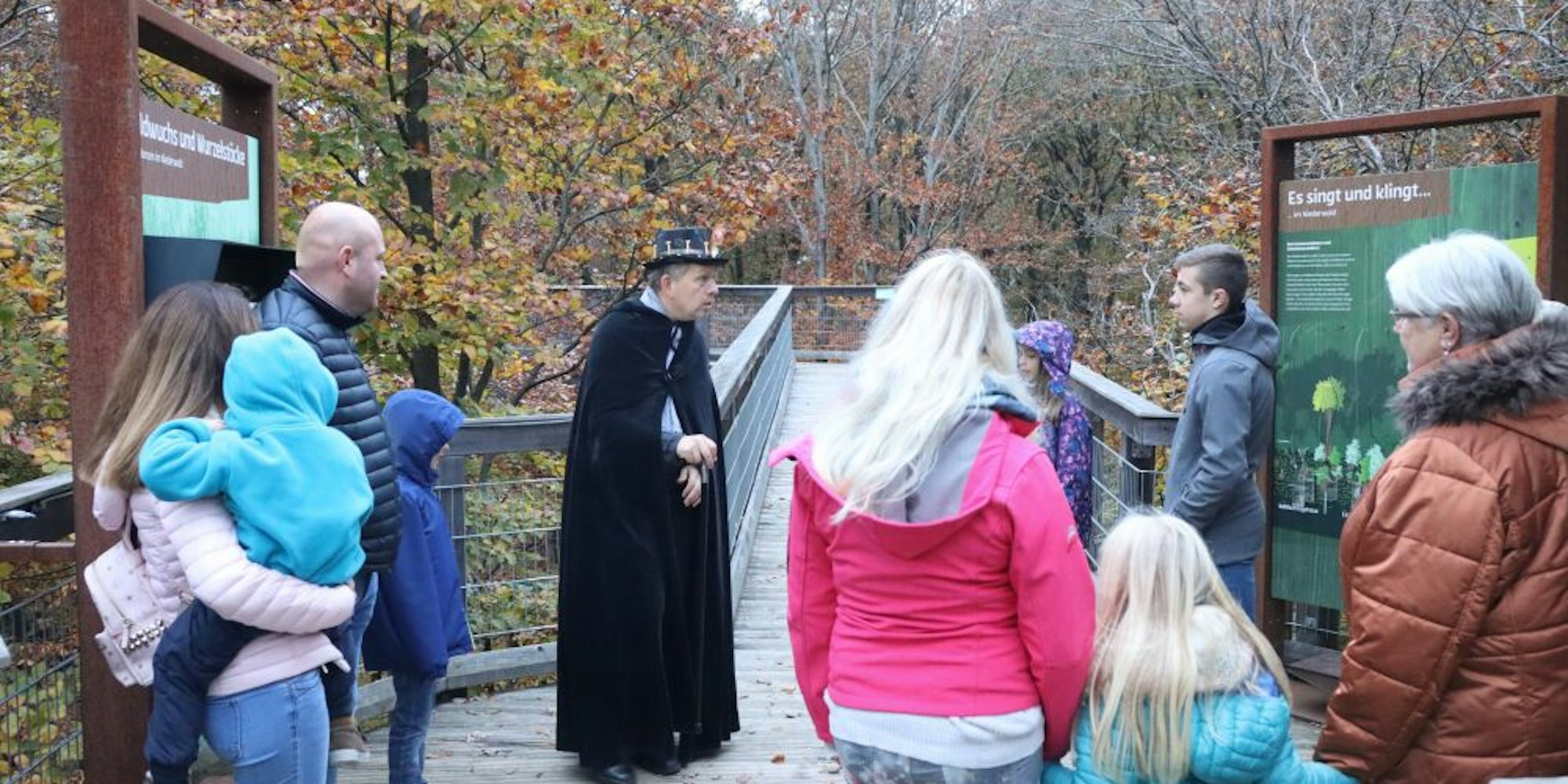 Gespannt lauschen die Zuhörer auf dem Baumwipfelpfad den Gruselgeschichten von Baron Samedi (M.) alias Patrick Mielke.