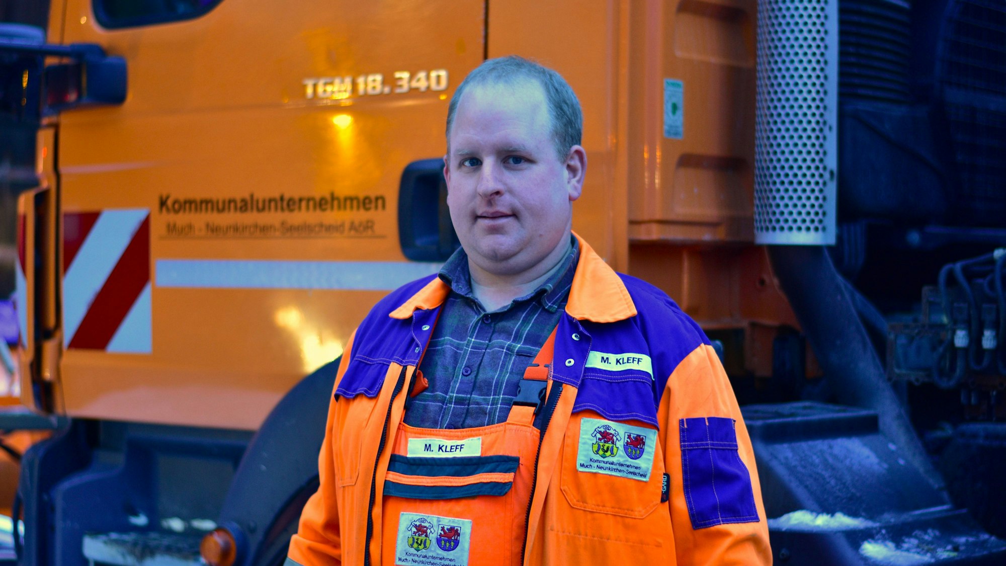 Die Mitarbeiter haben sich am frühen Morgen auf dem Gelände des Baubetriebshofs der Gemeinden Much und Neunkirchen-Seelscheid versammelt. Unter der Einsatzleitung von Reiner Kettwig öffnen sich die Hallentore pünktlich und die großen Räumfahrzeuge fahren raus auf die Straßen. In einem der Lkw sitzt Markus Kleff. Er arbeitet seit 2008 beim Bauhof und hatte am frühen Donnerstagmorgen Dienst.