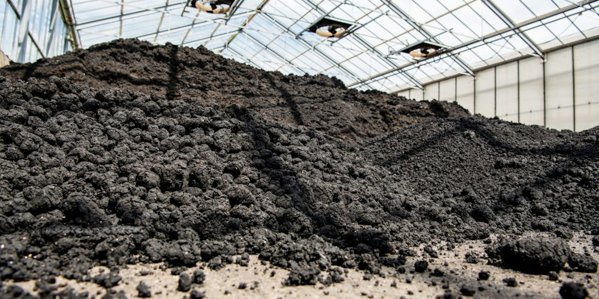 Noch nicht fertig getrockneter Klärschlamm wird in einer Halle in Süddeutschland zwischengelagert; eine Halle zur Lagerung soll auch in Eitorf entstehen.
