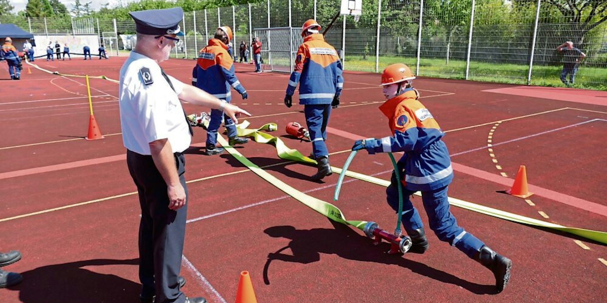 Die Gruppe der Jugendfeuerwehr aus Neunkirchen-Seelscheid ist im Durchschnitt noch etwas jünger als die der Lohmarer: Viel zurückhaltender sind die Anweisungen und Befehle, Priegnitz und Hermanns greifen ein, als die Kinder in die Öffnungen der Saugschlauch-Elemente fassen. Das sollen sie aufgrund der Verletzungsgefahr nicht. Das Ausrollen der Schläuche klappt dagegen ganz gut, mit einem gekonnten Wurf fliegt der neongelbe Schlauch in Richtung der Kameraden. Auch die Schiedsrichter sind zufrieden und sprechen ein Lob aus.