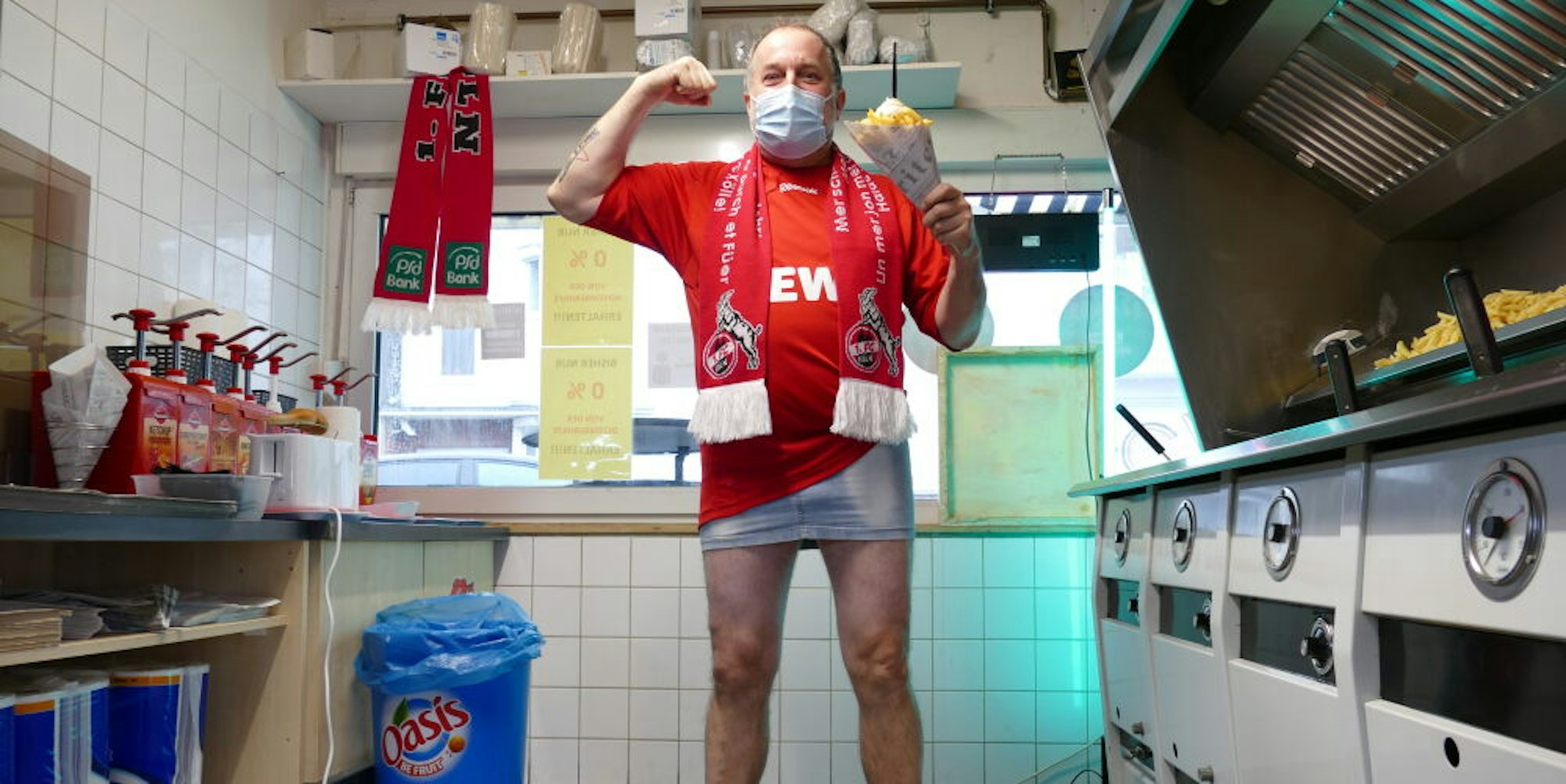„Wenn der FC heute gewinnt, bediene ich euch morgen im Minirock“, hatte der Inhaber des Troisdorfer Imbisses „Die Fritte“ am Samstag auf Facebook verkündet. Und der 51-Jährige ist ein Mann der Tat: Mit einem hellen und äußerst knappen Jeansrock stand er am Sonntag an der Fritteuse.