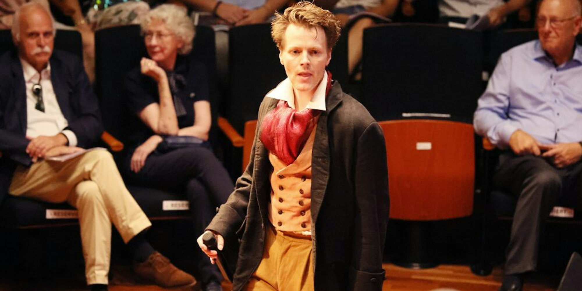 Der Gegner wird „gedisst“ – kreativ beleidigt, könnte man sagen – und die eigenen Fähigkeiten überhöht. „Auch im Streaming-Zeitalter bin ich Großverdiener“, rappt Schauspieler Marten „Mc Fly“ Münzberg oder an anderer Stelle: „Mach Klassik bei Spotify an und die Kasse klingelt.“ Denn seine Rolle ist bei diesem Kampf im Kammersaal der historische Battle-Rapper Ludwig van Beethoven.