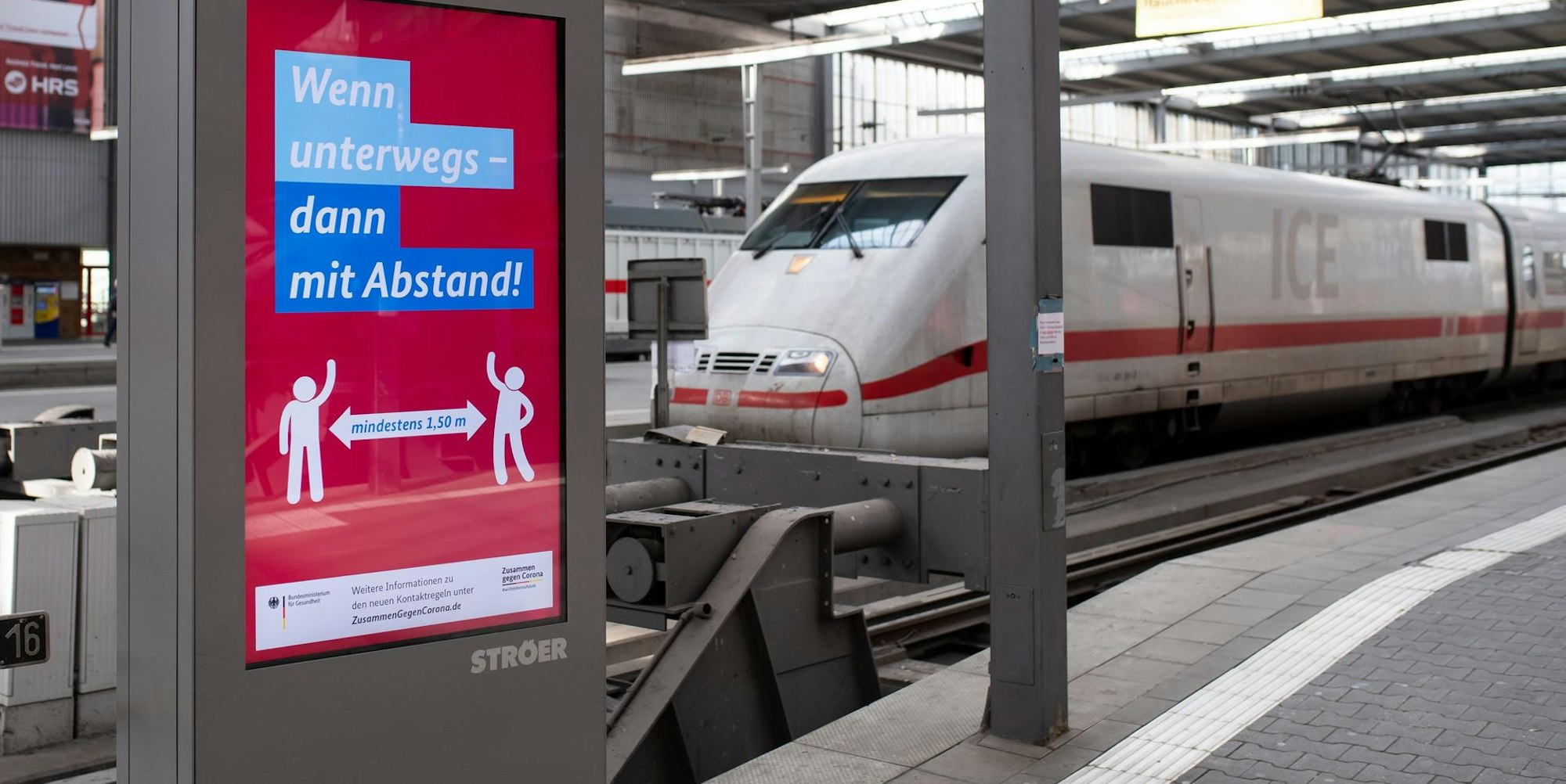 Im Münchner Hauptbahnhof ist auf einer Anzeigentafel zu lesen: „Wenn unterwegs – dann mit Abstand!“